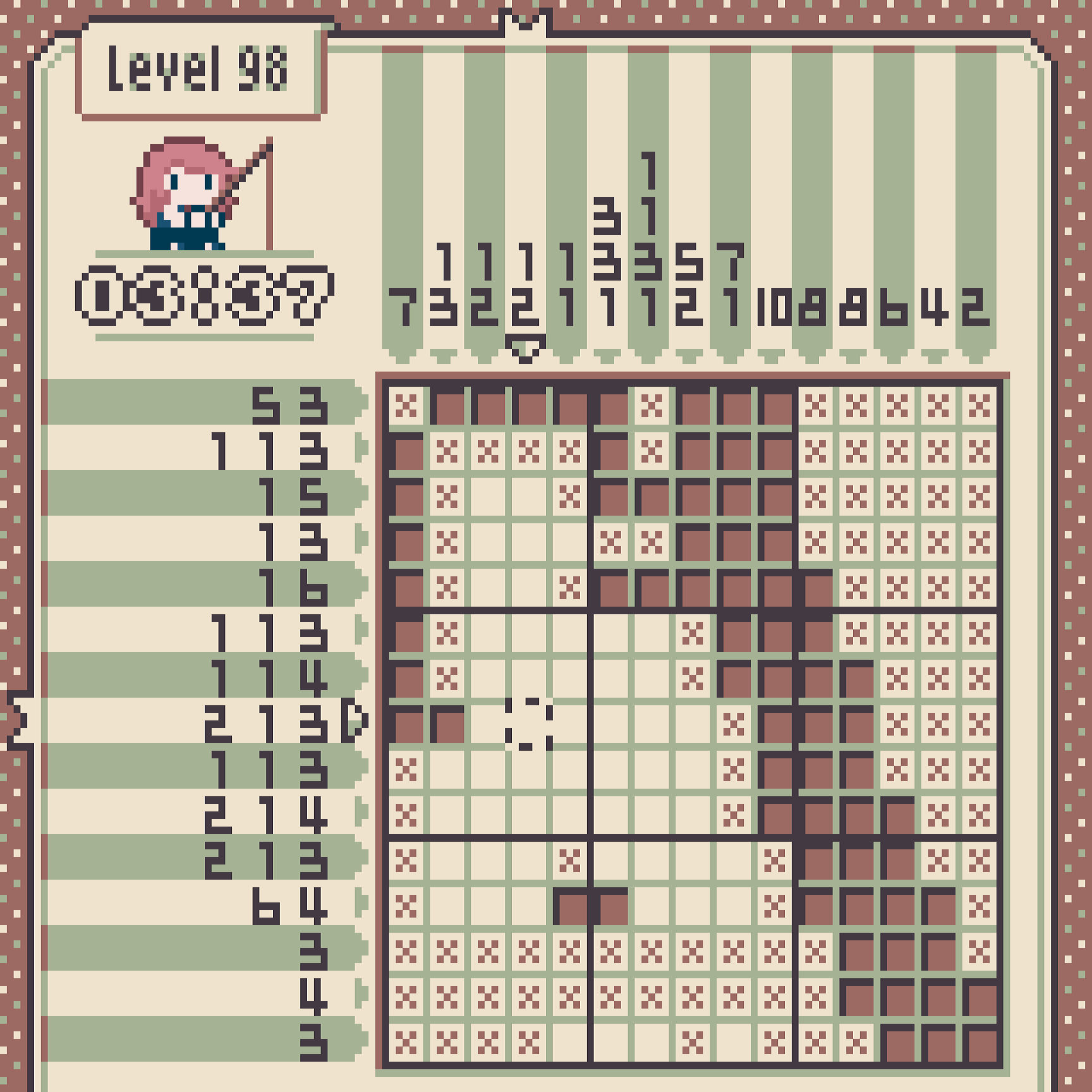 Walfie's Nonograms is a retro-styled logic puzzle game where each puzzle you complete transforms into a charming pixel art piece. Inspired by the Game Boy Color, the game evokes nostalgia with its classic color palette and minimalist design. Your task is to find the hidden numbers along rows and columns and uncover hidden images in Walfie's signature style.